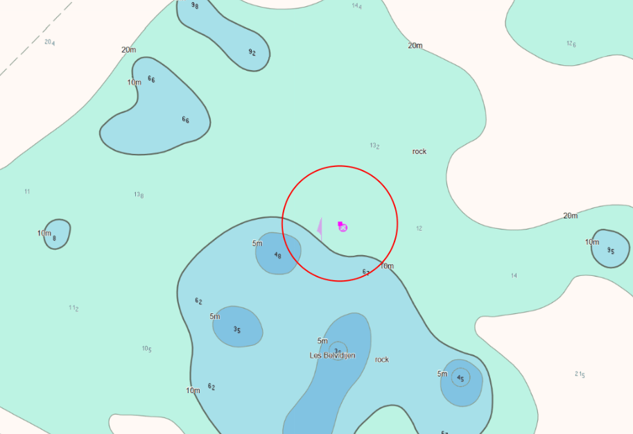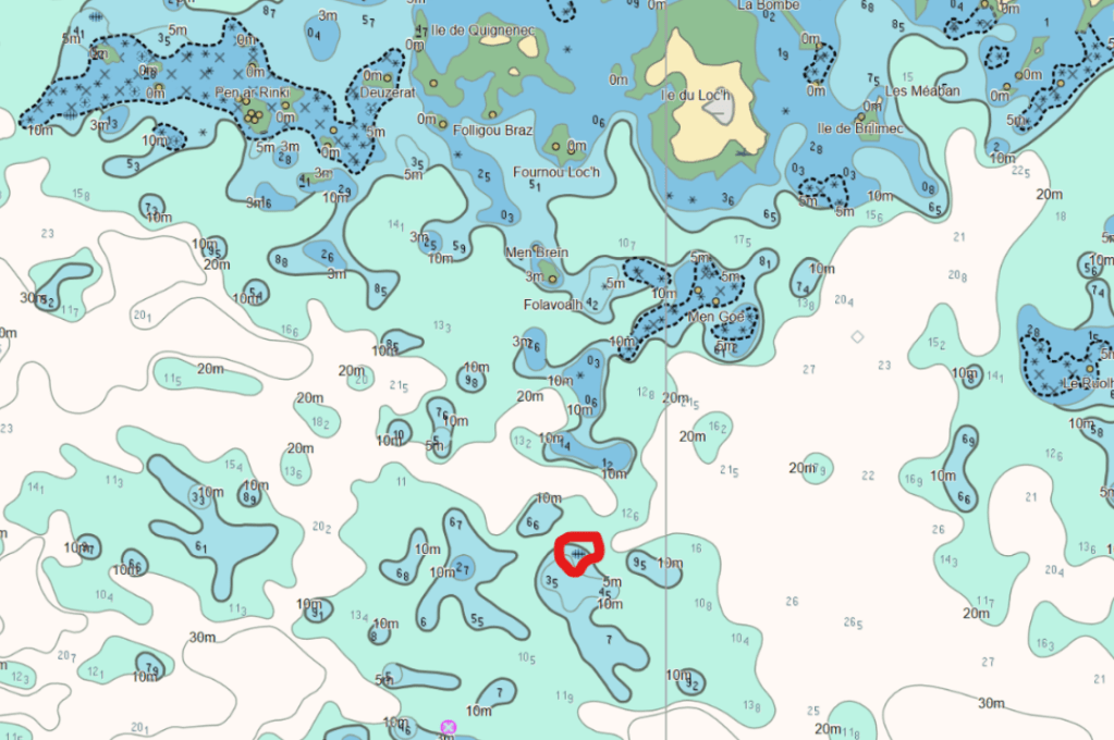 On comprend alors que se positionner à 10 m près n’empêche pas d’être dessus (ce qui n’a pas obligatoirement de conséquence ici, mais cela pourrait être une roche plus dangereuse …).