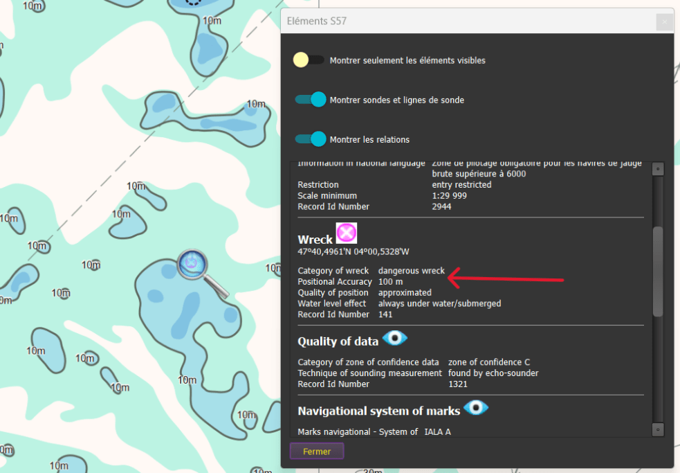 Exemple : Nous sommes dans le Sud des Glénan, et on voit cette épave sur la carte.