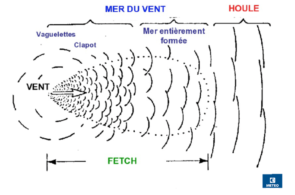 Les vagues sont des déformations de la surface de l’eau, principalement générées par le vent local. Elles sont irrégulières, contrairement à la houle, et se forment dans la zone de fetch (étendue d’eau sur laquelle souffle le vent).