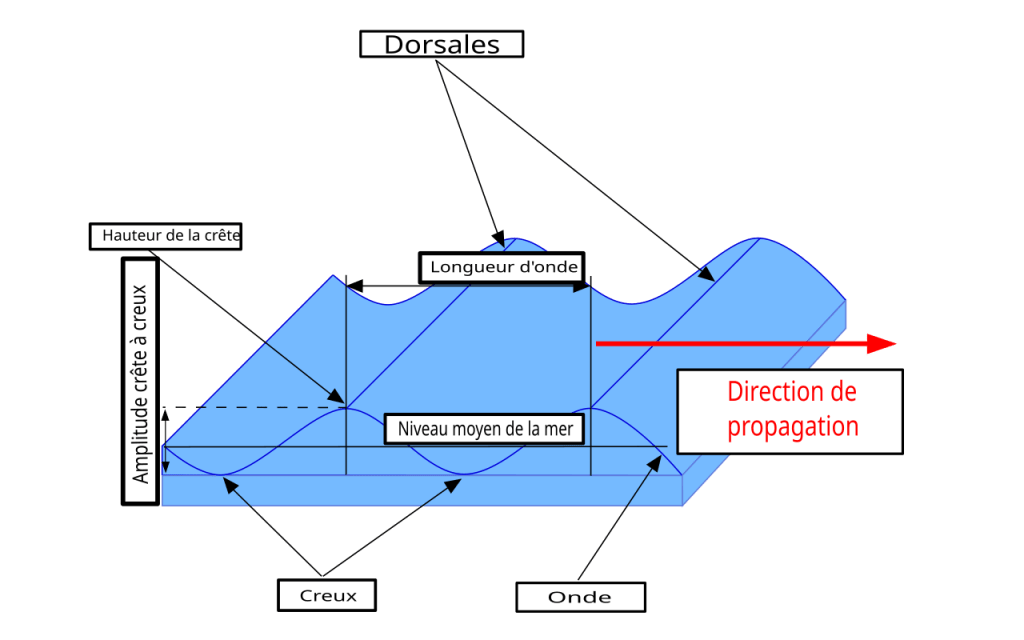 - Caractéristiques : La période de la houle est généralement de l’ordre de 10 à 20 secondes, et sa hauteur peut varier de quelques décimètres à plusieurs mètres.