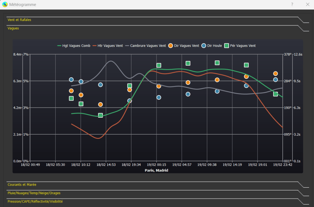 D’autres sources existent, comme les fichiers Gribs que l’on peut lire par exemple avec qtVlm. Selon les modèles choisis, ils contiennent les informations atmosphériques (force et direction du vent par exemple) et les modèles de vagues (houle, vagues etc …).