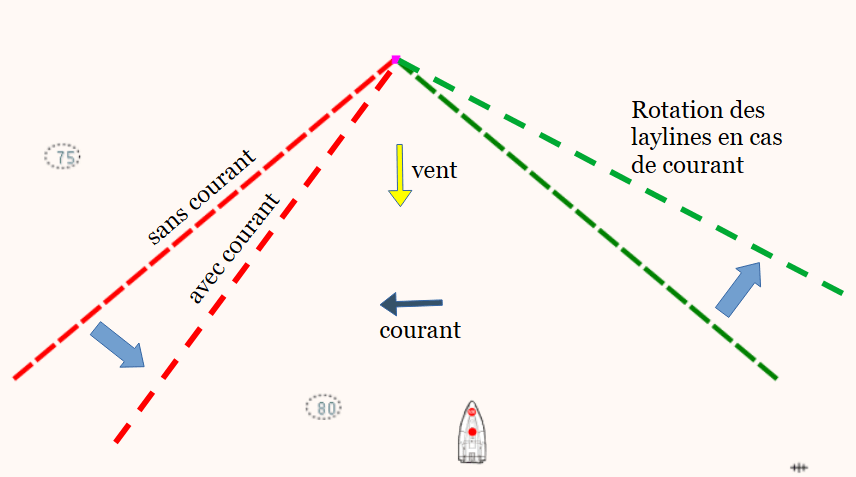 Le courant est l’un des paramètres à intégrer dans le calcul des laylines, il en modifie fondamentalement la géographie. Un courant traversier — perpendiculaire à la route — décale latéralement la route fond par rapport à la route surface.