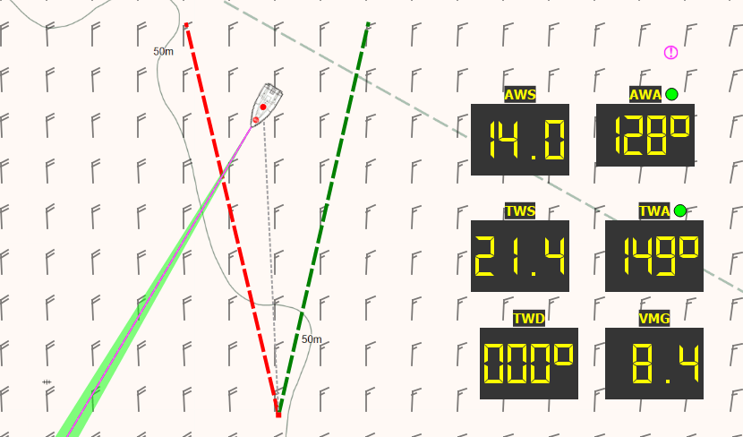 | 📌 La layline dynamique Sur un bon logiciel de navigation, la layline n’est jamais calculée comme une ligne fixe, mais comme une zone dynamique en perpétuelle réévaluation. Elle est recalculée en temps réel à chaque variation de vent. |