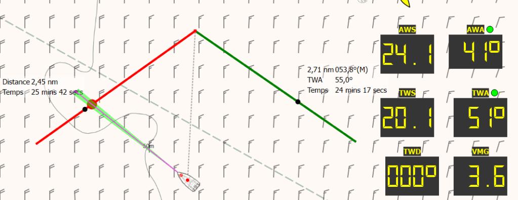 – Au près : Les laylines tribord et bâbord forment un « cadre » dans lequel le voilier doit naviguer. Si le bateau dépasse une layline, il devra abattre pour atteindre la bouée, ce qui rallonge sa route et réduit son VMG (Velocity Made Good, vitesse effective vers le vent). (Pour ceux qui ne sont pas habitués à ces termes, c’est par ici)