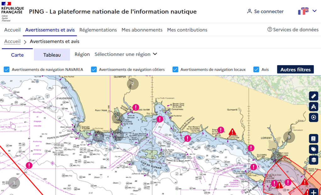 - Le SHOM (Service Hydraographique et Oceanographique de la Marine) : depuis Avril 2024, le SHOM à mis en place la plateforme ‘PING’ permettant de consulter les informations nautiques (https://portail.ping-info-nautique.fr/avurnav-notice). Il est possible de s’abonner pour les recevoir par email.