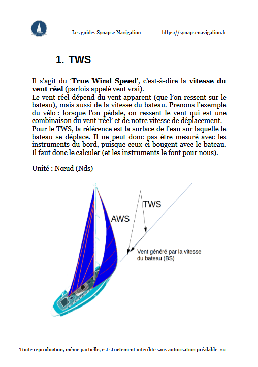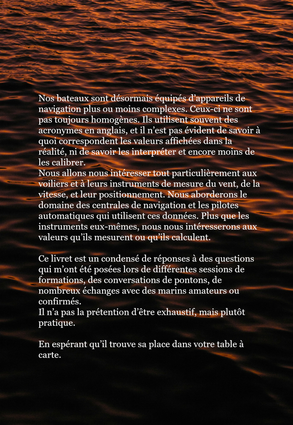 Ce guide parcours les valeurs couramment affichées par nos instruments de navigation (AWS, AWA, TWS, TWA, GWS, GWA, etc …). Il les explique et les visualise sur un croquis associé à chaque valeur. Après un tour rapide sur les technologies des capteurs habituels, nous donnons des méthodes pratiques pour calibrer correctement ces capteurs (compas, loch, anémomètre, girouette). Nous abordons ensuite quelques notions plus complexes telles que la VMG et VMC. Enfin, des notions sur les pilotes automatiques permettent de se familiariser avec ceux-ci et de les régler au mieux.