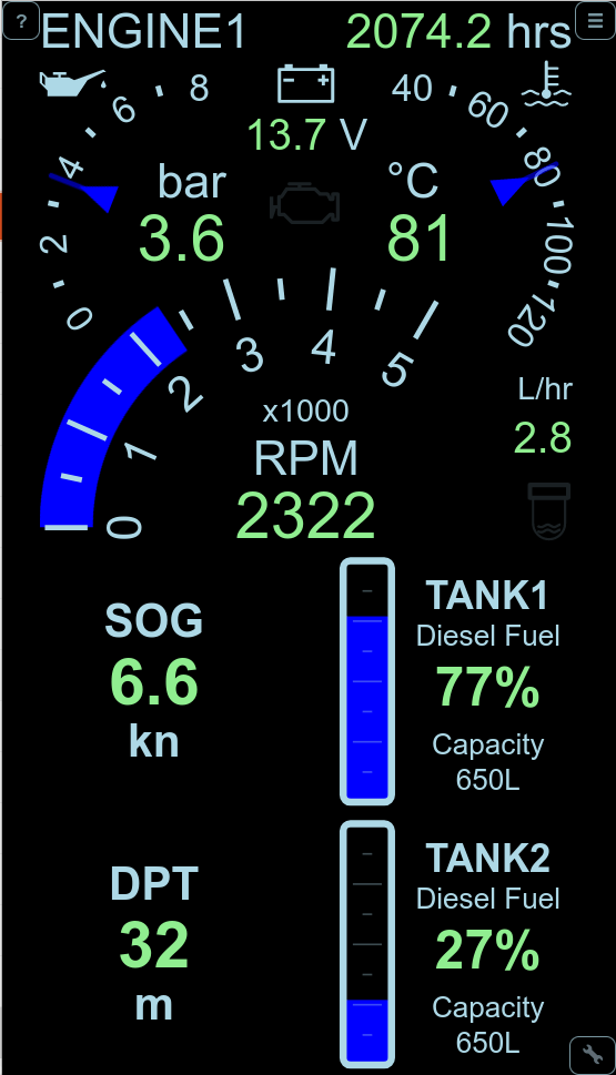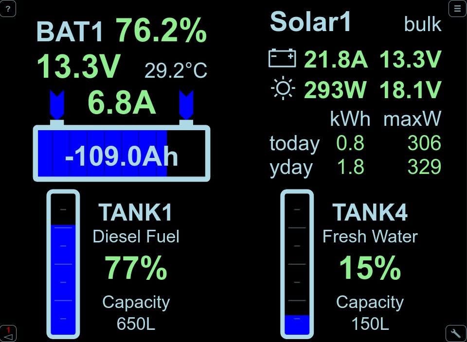 - Montrer le tableau de bord du moteur, les niveaux de réservoir, les chargeurs de batterie ou les panneaux solaires (connectez les appareils Victron !), afin que vous ayez toutes les données du bateau en un seul endroit