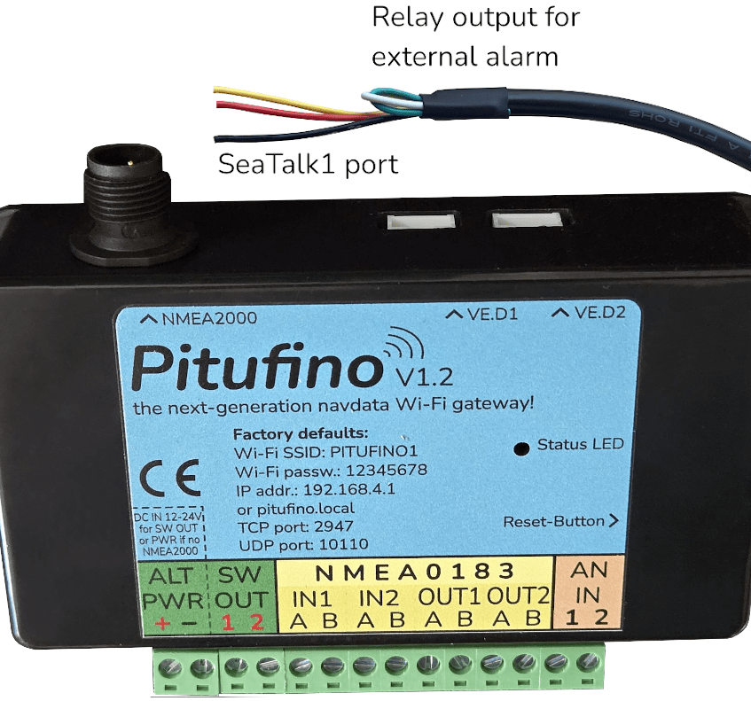 - sortie relais optionnelle pour buzzer/sirène d’alarme externe (avec module Seatalk ou Pitufino ST)