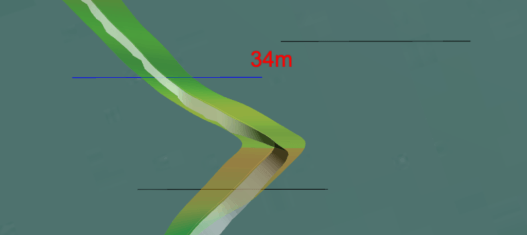 Ruban horizontal : Vitesse du vent le long de votre trajectoire (sombre : plus faible, clair : plus fort; mais aussi rouge : ‘tourne a gauche’, vert : ‘tourne à droite’)