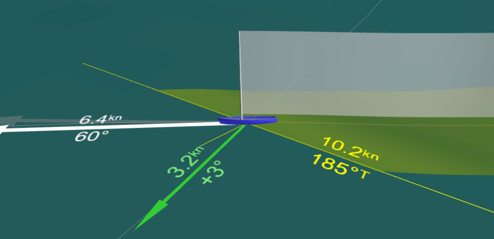 Flèche verte : VMG et variations du vent (adonnant ou refusant par à la moyenne du TWA du bord)